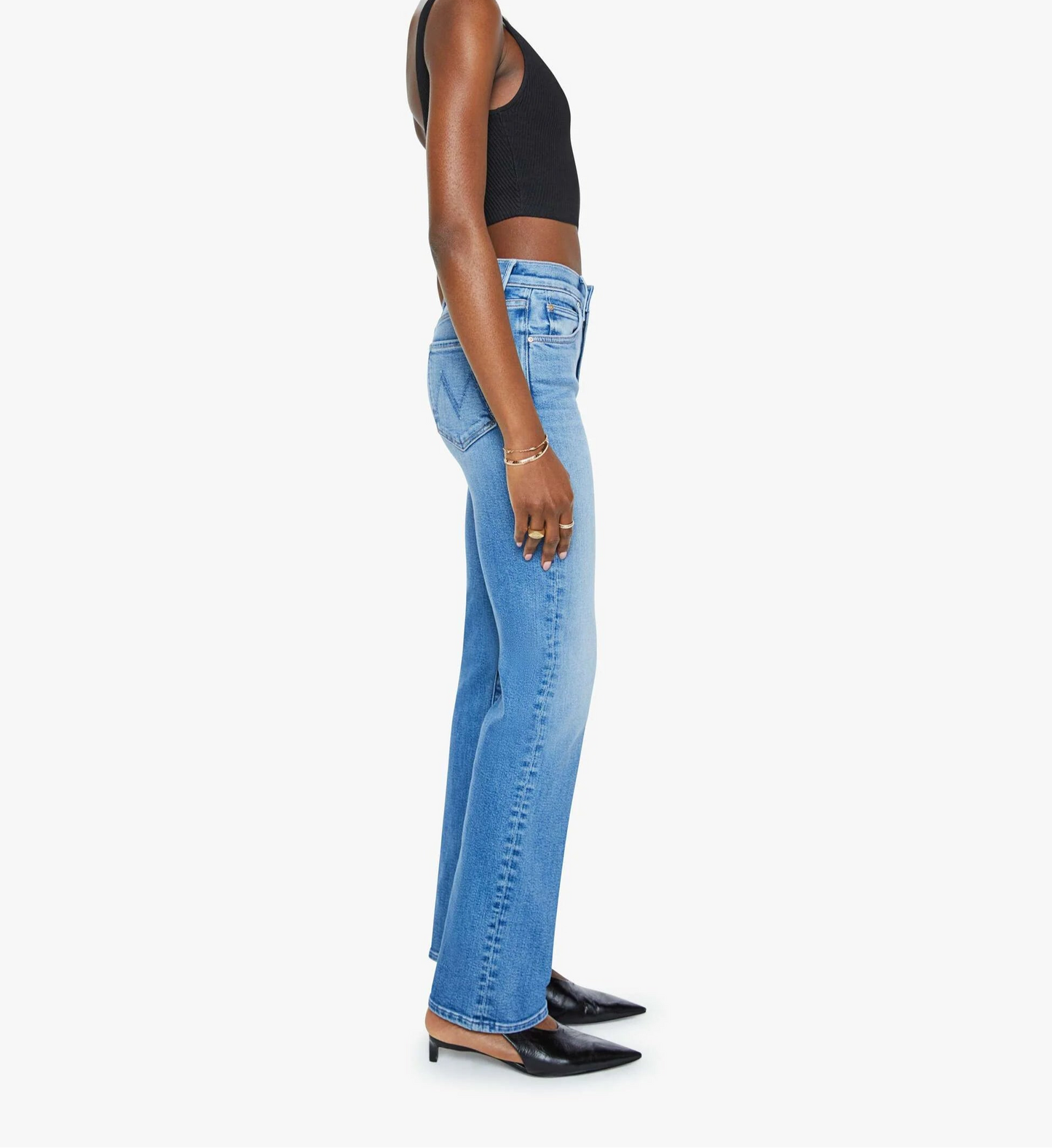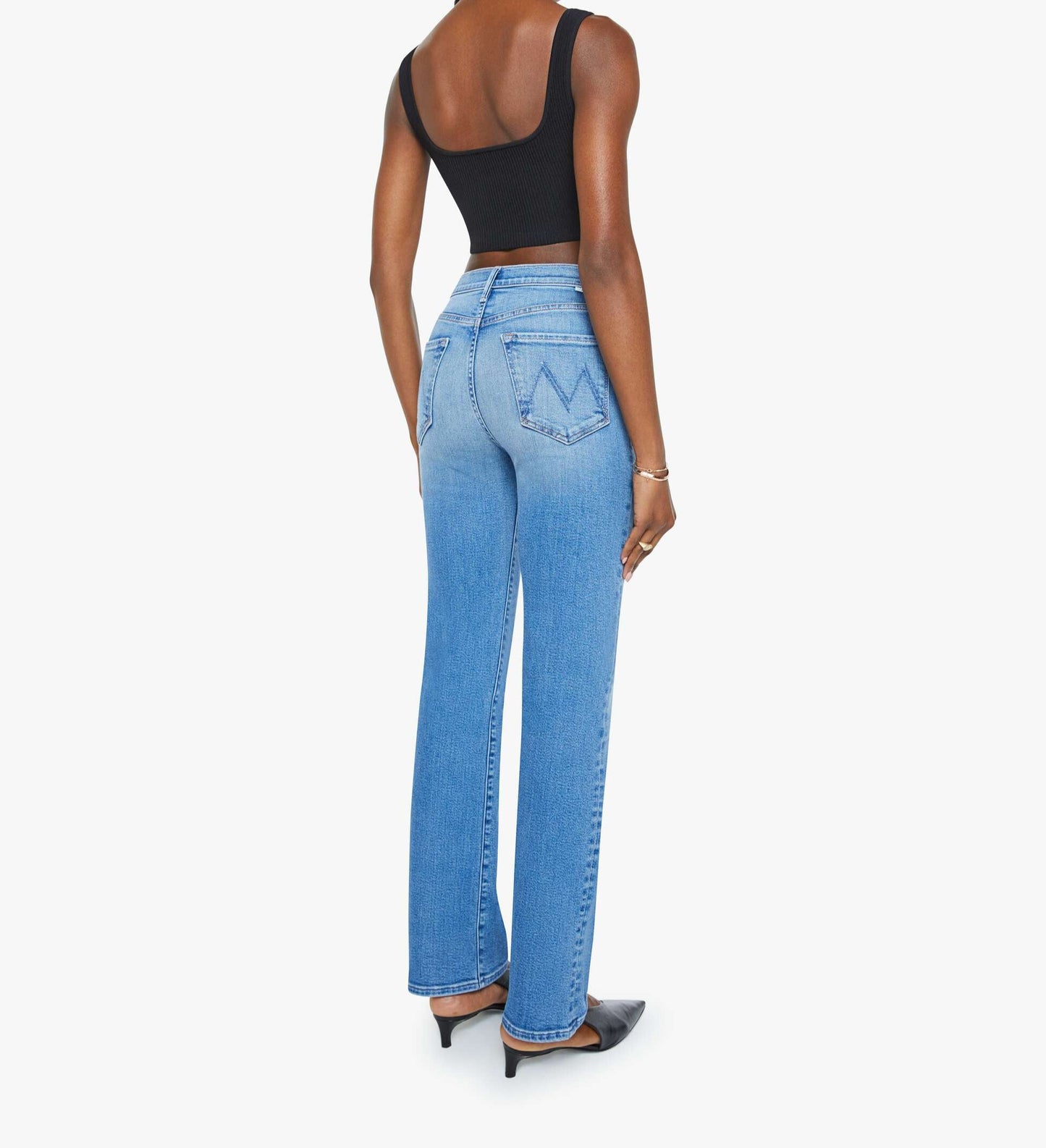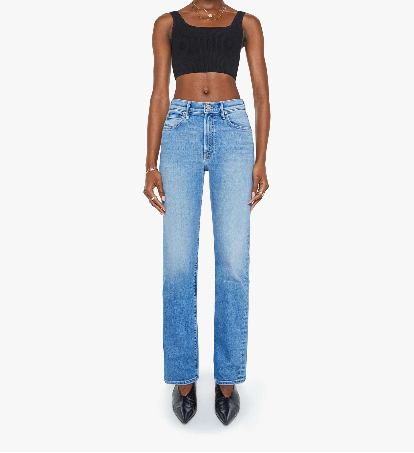 Crowd pleaser. A high-rise straight leg jean with a 32-inch inseam and a clean hem. Cut from stretch denim, Fan Favorite is a mid-blue with whiskering and fading at the knee.